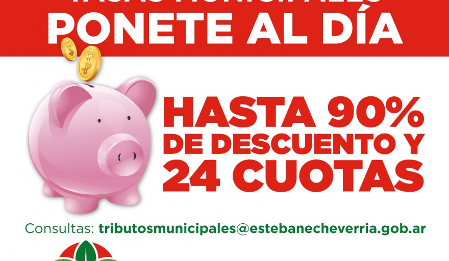 El Municipio de Esteban Echeverría extendió hasta el 30 de septiembre de 2024 la moratoria que otorga facilidades para que las vecinas y los vecinos puedan regularizar su situación y ponerse al día con el pago de las tasas municipales. El beneficio consiste en la quita de hasta un 90 por ciento en los intereses generados por la deuda -si esta se abona al contado- y planes de hasta 24 cuotas en el pago del Tributo Municipal por la Propiedad, las Tasas Automotor y Motovehículo y la Tasa de Seguridad e Higiene, entre otras.