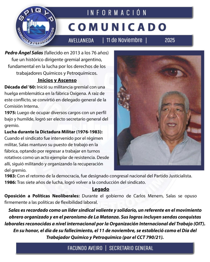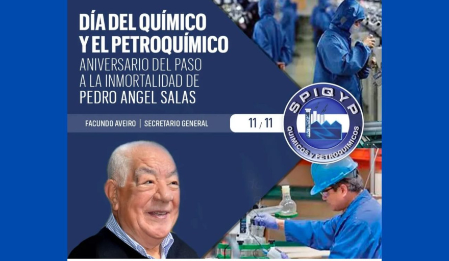 A través de un comunicado, el Sindicato del Personal de Industrias Químicas y Petroquímicas -SPIQyP-, que conduce Facundo Aveiro, celebra el Día del Químico y Petroquímico este 11 de noviembre, fecha en la que en 2013 falleció el histórico dirigente del sector, Pedro Angel Salas.