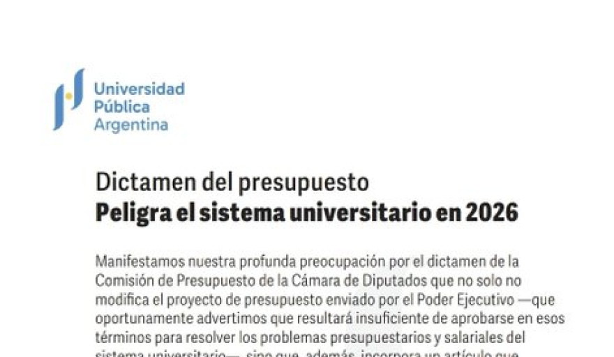 A través de un comunicado conjunto, el Frente Sindical de Universidades Nacionales, la Federación Universitaria Argentina y el Consejo Interuniversitario Nacional manifestaron su preocupación por el dictamen de la Comisión de Presupuesto de la Cámara de Diputados y la perspectiva que abre para el futuro de la Educación Pública Superior: