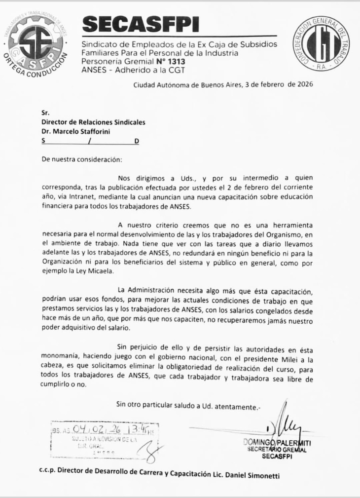Al cierre de esta edición, SECASFPI presentó una nota en la Dirección de Relaciones Sindicales de la ANSES para rechazar la obligatoriedad de la polémica capacitación.