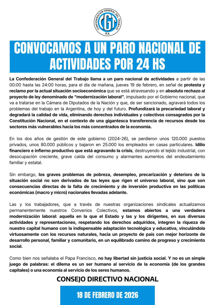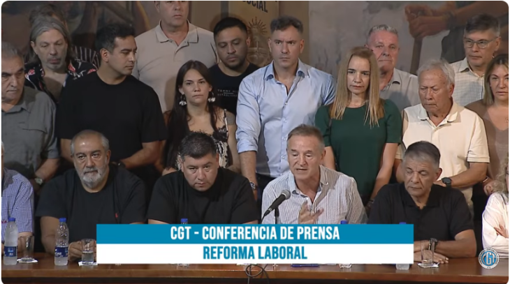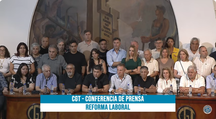 En conferencia de prensa, la CGT anunció un paro nacional por 24 horas para este jueves 19 o el día en que la Cámara de Diputados trate el proyecto de Ley de Modernización Laboral, iniciativa que la central califica como "regresiva".