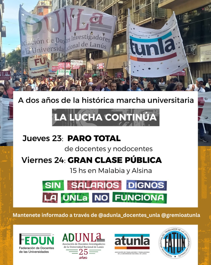 "A dos años de la histórica marcha universitaria, y luego de la aprobación de la Ley de Financiamiento Universitario, los Docentes y NODOCENTES seguimos luchando por becas estudiantiles, salarios dignos y fondos necesarios para que funcionen las universidades", expresaron conjuntamente la Asociación de Trabajadores y Trabajadoras de la Universidad Nacional de Lanús -ATUNLA. y la Asociación de Docentes Investigadores de la UNLa -ADUNLA- en la previa al paro de 24 horas que realizarán a nivel federal FATUN y FEDUN, organizaciones de segundo grado a las que respectivamente pertenecen.